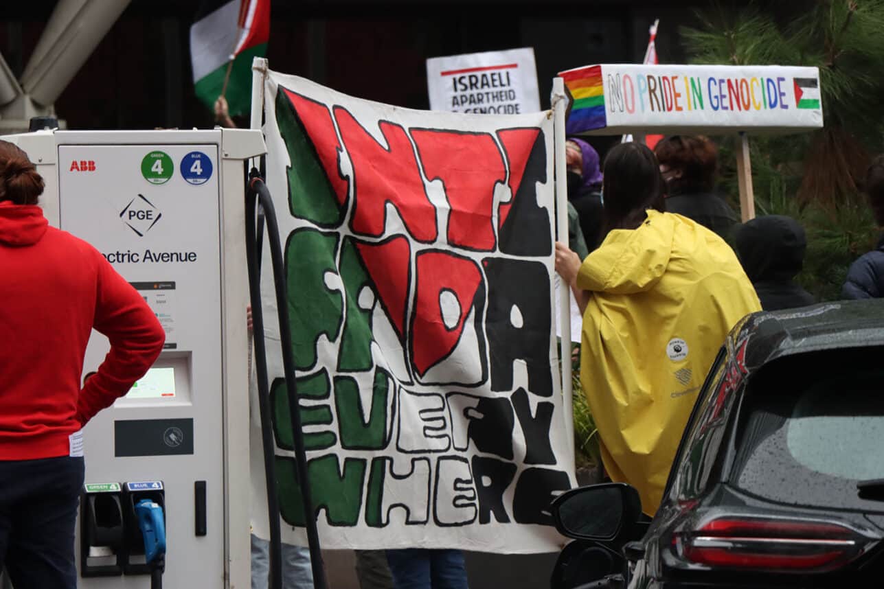 In Portland, Oregon this situation is exacerbated by the fact that various violent groups, from anarchists to radical Socialists, have embraced the Reed student SJP warriors. This is exactly what happened on November 9th when the SJP and JVP students joined in with these outside groups and orchestrated a campus shut down for Gaza. While the actual number of student protesters did not exceed 150 or so, their rhetoric engulfed the entire college, charging the air with the banners and cries for “Global Intifada,” “Intifada everywhere,” and the banner “Hitler would be proud” next to the Palestinian flag, which most likely meant that Hitler would be proud of Israel for committing genocide, a staple of Soviet anti-Zionism. The event was covered by the only student newspaper on campus, The Reed College Quest, available online to everyone outside the college.