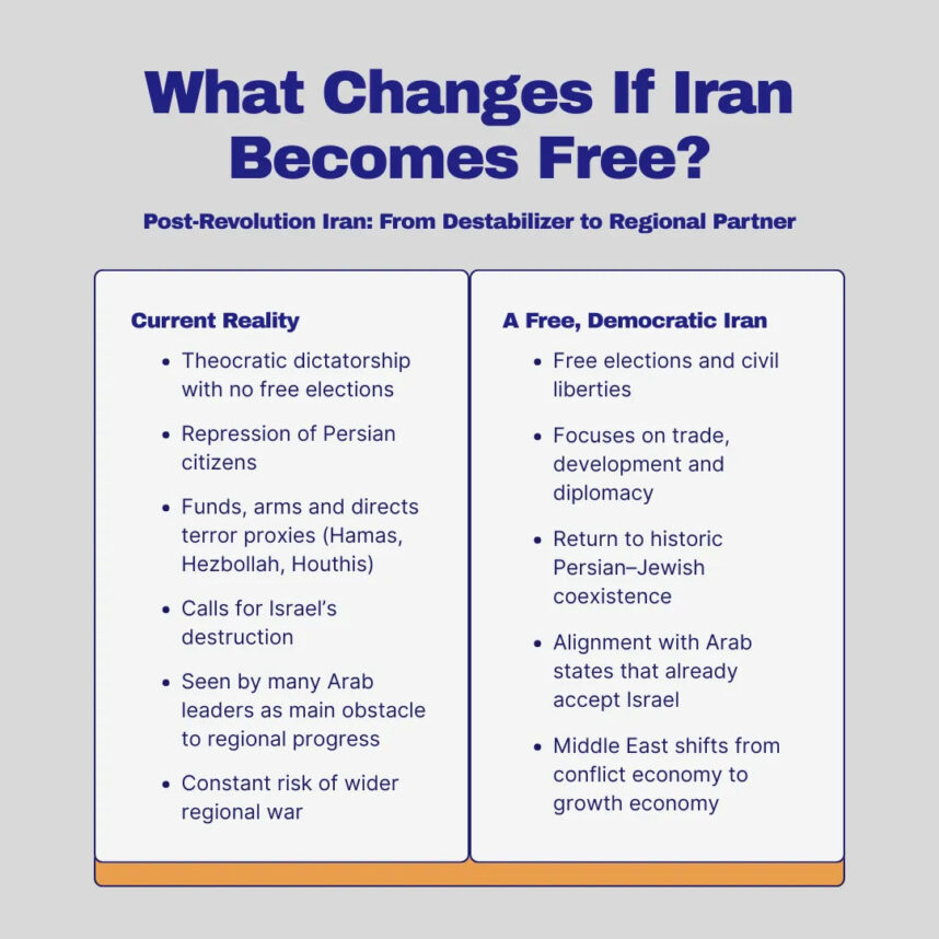 Therefore, a free, democratic Iran would almost certainly stop funding terror, normalize ties with Israel and become a more peaceful, trade-based partner for prosperity.
