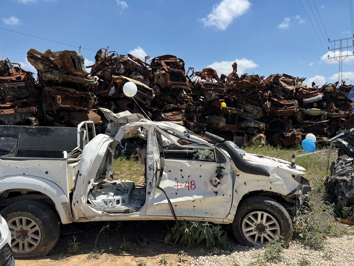 From there we traveled nearby to the “Car Cemetery” where over 1,500 cars from the Nova Festival, Kibbutzim and roadside attacks were brought. Forensic experts had removed over 250 bags of human ashes from these cars where the barbarians burned their victims alive, shot multiple machine gun rounds through the doors and windows and finished off others with RPG grenades. You see cars stacked up and cars spread out over what looked like at least three football fields, all either burned or shot up. A monument has already been set up with the word “Yizkor” (Remember) and basins to light memorial candles.