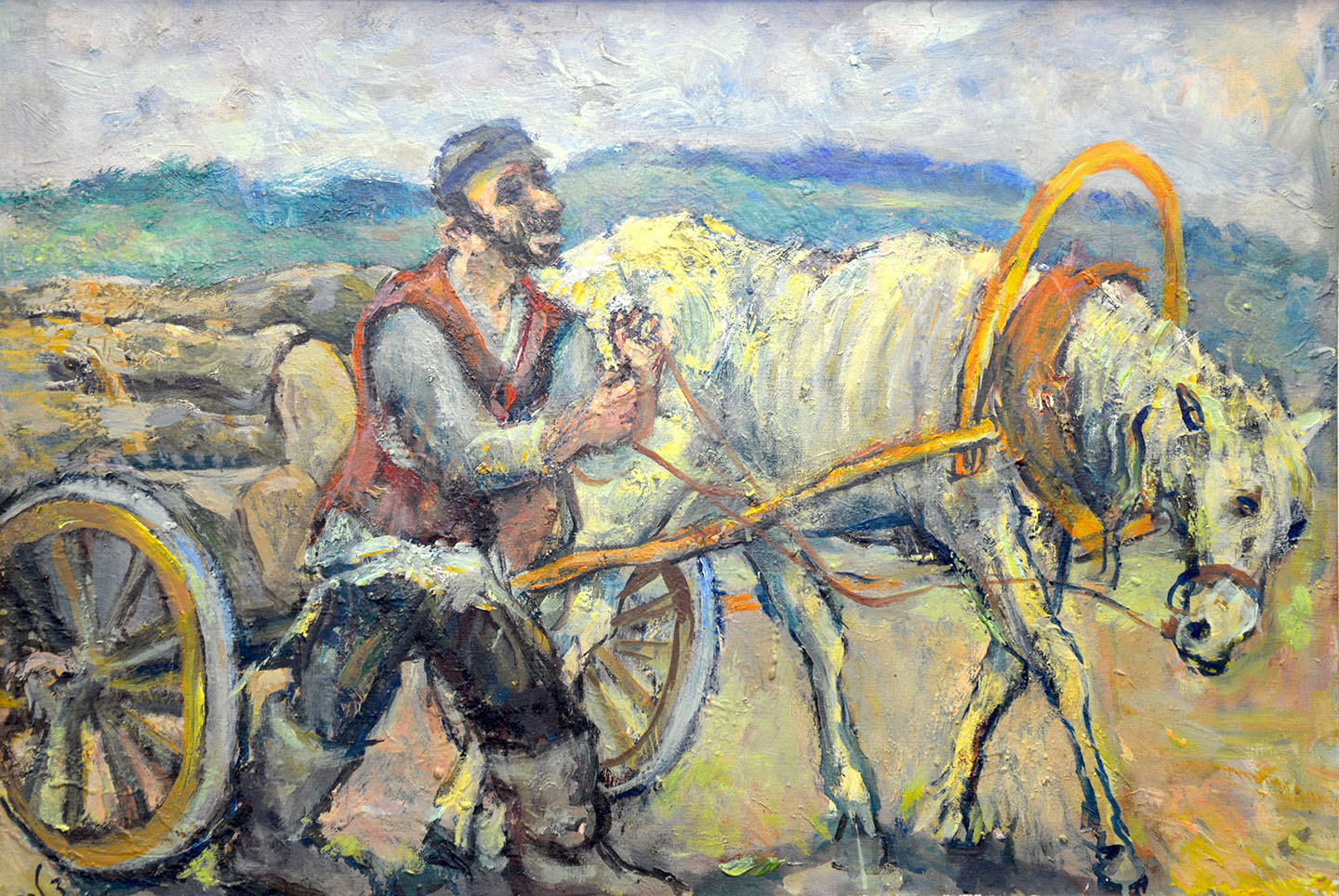 Labkovski himself was born in Vilna, Lithuania, and endured extraordinary hardship. Arrested and sentenced to Siberia as an “enemy of the State,” he survived the brutal conditions there in part through his art. When he returned home after the war, Vilna—once a thriving center of Jewish culture—lay in ruins. He stayed there for 14 more years and in 1958 he immigrated to Israel, where he continued to paint, determined to preserve not only the destruction he had witnessed but also the richness of Jewish life that had been lost. Those were the same landscapes that Aleichem described so vividly and lovingly in his stories.