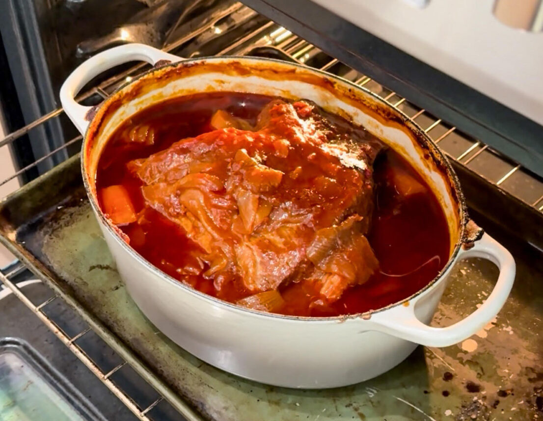 - Add in chopped carrots and stir into the mixture. Add back in the brisket and cover with the sauce. Add in bay leaves, rosemary and thyme. Cover with a Dutch oven lid and add to the oven for 3-31/2 hours until the brisket is tender.