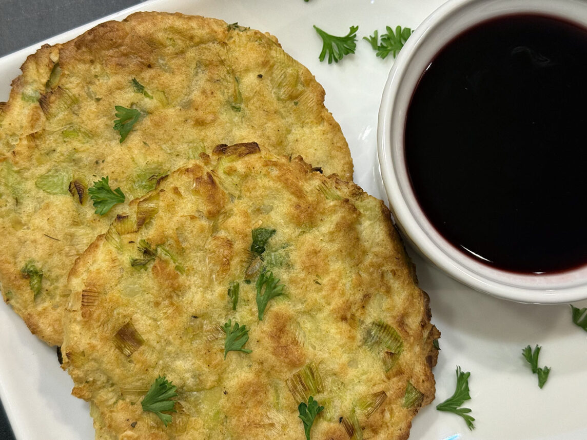 “Lightly brushing the leek patties with oil before cooking maintains both tradition as well as preserving crisp edges and a warm, fluffy center of latkes,” she said. “Replacing the traditional sour cream and applesauce for a pomegranate-honey sauce, this recipe adds a ruby-red drizzle bringing color and a hint of sweetness to the dish.”