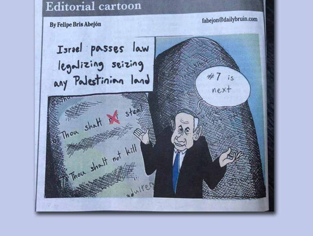 So if the Ten Commandments and other mitzvot are at least one of the cornerstones of the Torah, and the Torah is the foundation of Judaism, and Israel is the Jewish state, then someone who decides to draw a political cartoon using the Ten Commandments to criticize Israeli policy would appear to be on pretty solid ground. That’s what a UCLA contributing cartoonist, Felipe Bris Abejón did when he published a cartoon in the “Daily Bruin” newspaper, a cartoon now notorious for having been criticized as anti-Semitic and withdrawn by the paper with apologies. The cartoon in question, shows Israeli Prime Minister, Benjamin Netanyahu, standing in front of two commandments, one (listed as #6) with a word crossed off: “Though shalt not steal” and another (listed as #7) “Thou shalt not kill.” The caption says, “Israel passes law seizing any Palestinian land,” and Netanyahu is saying, “#7 is next.”