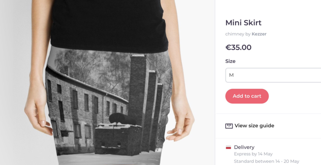 .@redbubble Do you really think that selling such products as pillows, mini skirts or tote bags with the images of Auschwitz – a place of enormous human tragedy where over 1,1 million people were murdered – is acceptable? This is rather disturbing and disrespectful. pic.twitter.com/cdPvZGMXC6
