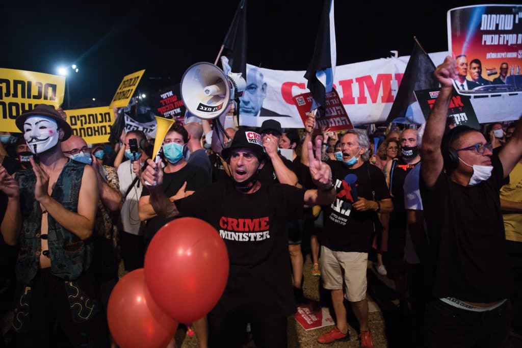Thousands of Israelis protest against the government’s response to the coronavirus crisis on July 11 in Tel Avivl. Photo by Amir Levy/Getty Images