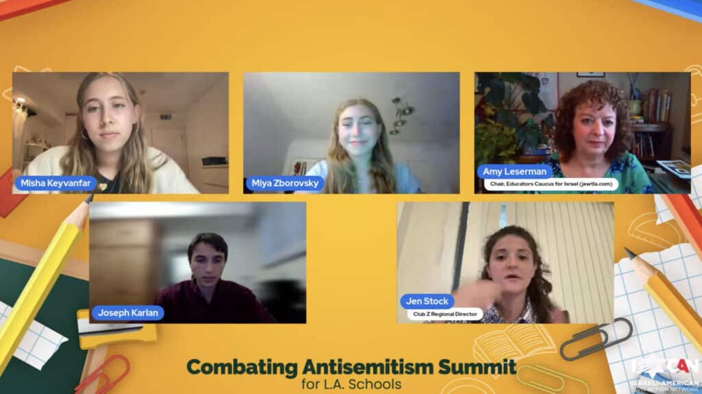 The Student Hearing on Antisemitism in Los Angeles Schools webinar was part of ICAN’s Combating Antisemitism Summit and was done in collaboration with Club Z––which facilitated the students’ testimonies––as well as Educators for Israel and other organizations. The first student to provide testimony was Misha Keyvanfar, a sophomore at Palisades Charter High School, where she serves as the president of external affairs of the school’s Students Supporting Israel (SSI) chapter and president of the school’s Jewish Student Coalition. Keyvanfar recounted how, as a sixth grader, she saw a swastika drawn in the school bathroom and the following year, one of her classmates “insulted and belittled Jews as a whole” and called her “a yucky Jew.” “His voice was not alone,” Keyvanfar said. “In fact, it was amplified and multiplied throughout my LAUSD middle school and later high school years.”