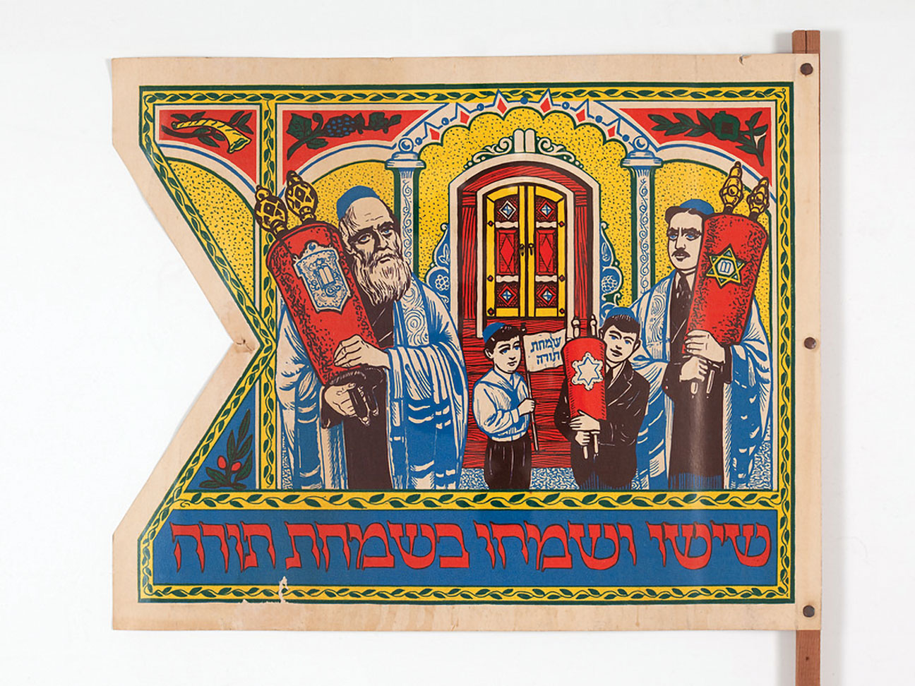 The Library’s archives house a breathtaking array, including 18th century woodcuts from Amsterdam, greeting cards depicting artistic renditions from 19th century New York, and others from Eastern European communities of the early 20th century. As the head of content at Yad Vashem, Chen Malul, has noted, “Jews of Eastern Europe designed Simchat Torah flags reminiscent of the banners of European knights and cities, but replete with Jewish motifs. Thus, the members of the community hinted that the flags of the Jewish people – in contrast with medieval Christian tradition – were flags of the Torah and its commandments, and not symbols of warfare and bloodshed.” A stunning sample from more modern times, a 1902 flag from Warsaw, depicts the icons of the Twelve Tribes, a menorah, a Star of David – with Moses, Aaron the High Priest and Theodor Herzl in the center.