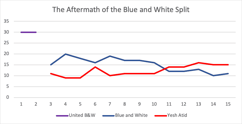 Second – the current coalition is more seats in the Knesset (73) than in the polls (close to 69). This is because public support for some of the parties that joined the coalition went down (in the case of Labor to zero seats).