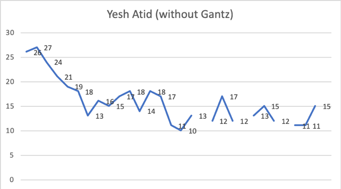 This is what the Yesh Atid Party looks like in polls since the beginning of the year. It looked in a much better position when Gantz was not yet a part of the picture. It currently looks as just one of many second tier parties. The average for Yesh Atid in polls since December 25 is 13 seats, two more than it currently has in the Knesset.